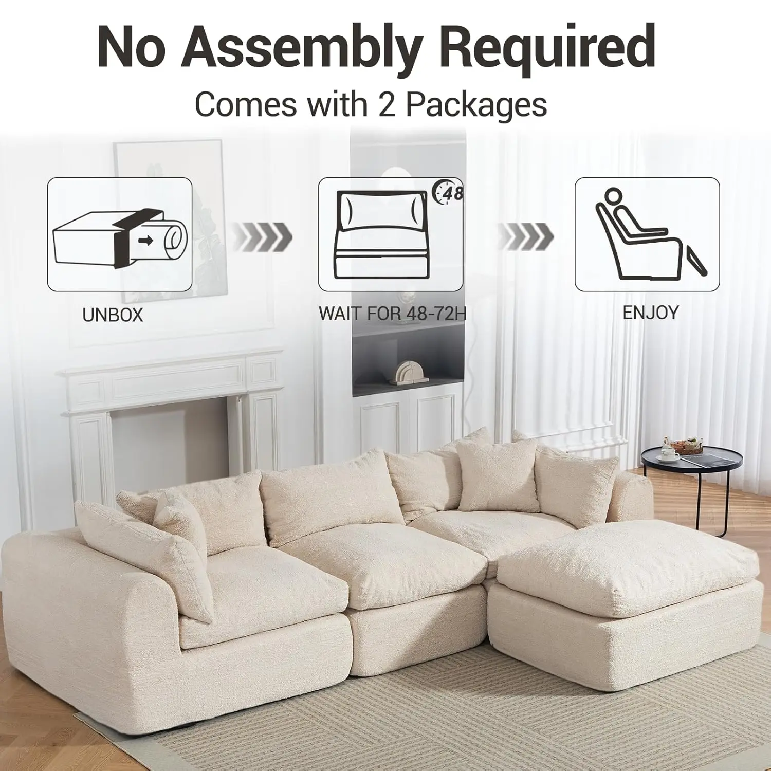 【No Assembly Required】No tools or setup are needed. Simply unpack and let the cushions expand naturally within 48 to 72 hours. Minor size or fabric variations are normal. The sofa ships in two boxes for easy transport through narrow spaces.